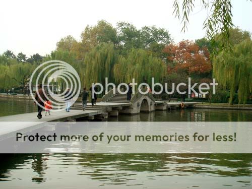 跟遲一步到達的小苑和阿葉會合之後,我們就搭的士來到西湖邊某個不知名的景點。本來打算跟其他自助旅行的人一樣,辦一張公交IC卡,然後騎杭州市給遊人安排的單車環湖遊玩──租單車非常便宜,只要有IC卡(RMB 300保證金,退卡時可領回),就可自助把單車解鎖(所以沒有使用時間的限制),費用好像是首一小時免費,後面的累計,用得越久越貴,不過也是五塊錢以下的事,有N個還車點,基本上在西湖及周邊一帶每個路口都有,自己把車鎖回去就是了。租單車十分容易,但找地方辦IC卡就不容易──我死活不明白為啥不乾脆在Tourist information處就可辦理。