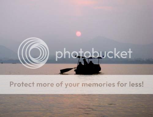 走了幾步,我們就看到一些岸邊的一些小船。之前看資料,就看過有人在遊記裡說遊西湖要坐小船不要坐大船。這種小船可以自己划,也可以僱人來划。自己划大概天黑也無法靠岸,我看船夫是穿制服的,理論上是官方認可的機構,應該不會把我們划到湖中心才來勒索(我承認我心理陰暗,不過陰暗如我也在周莊中招,雖然也沒什麼損失),RMB 160一船,橫越西湖大約45分鐘,人工費也要了,於是我們就上了船。