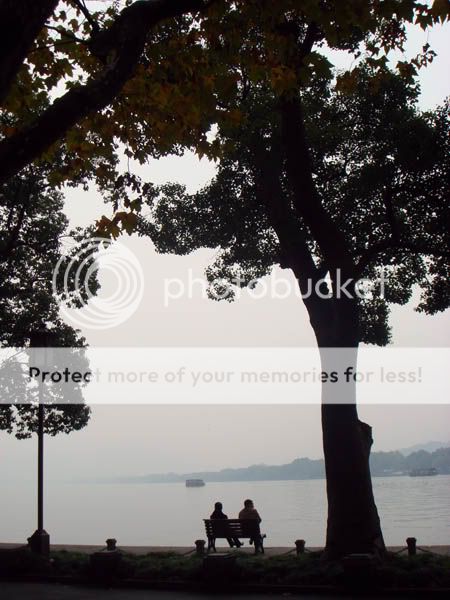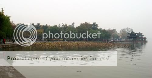 白堤附近其實有很多荷花,不過我們在這種奇怪的季節來,就只有殘花禿莖可以看了。站在正宗的江南楊柳岸,我幻想了一下夏天荷花開遍的景象──不含浪漫成份,我第一個想起的其實是成千上萬人潮洶湧的景象,還有人多的時候像我這樣站在岸邊,很可能會被推進水裡──就聽到某位大嬸唸著:「四面荷花三面柳,一城山色半城湖」。我很驚訝──不是為了人家大嬸有文采,而是居然我也懂耶!